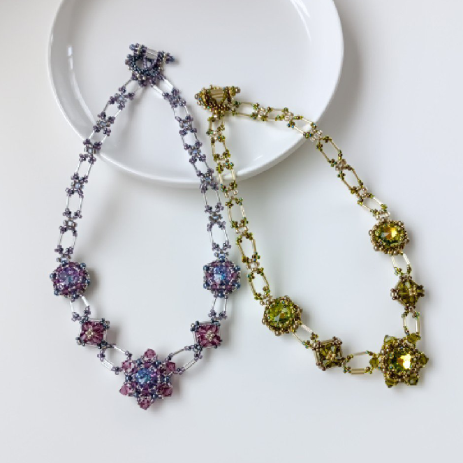 丸小ビーズ、丸大ビーズ、特小ビーズ、竹ビーズ、パール、クリスタルガラス、シャンデリアパーツを使用しています。